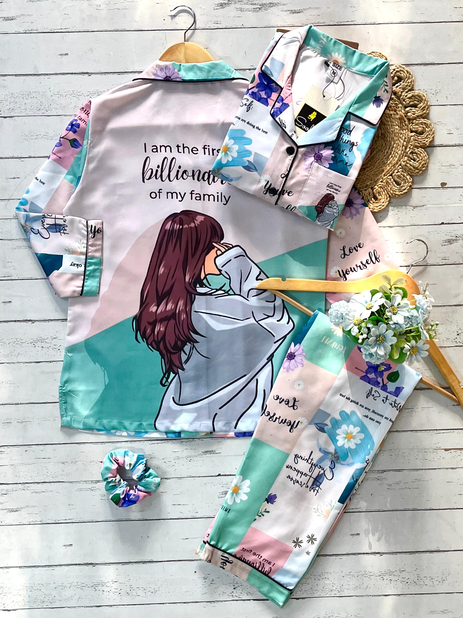 Sleep in style and confidence with our Statement Back-Print PJ Set. Featuring the quirky slogan “I Am the First Billionaire in My Family” on the back, this set is all about manifesting dreams while staying comfy. The soft, breathable fabric keeps you cozy, while the bold back print makes it a perfect mix of lounge and statement wear.